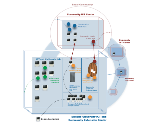 - Procure new and/or reused computers, ICT and multimedia peripherals, and server technology and install them at the Maseno University ICT Monitoring and Community Extension Centre. Establish 4 additional satellite ICT and multimedia community centers based in primary schools. Connect all centers centrally to the Maseno University location.